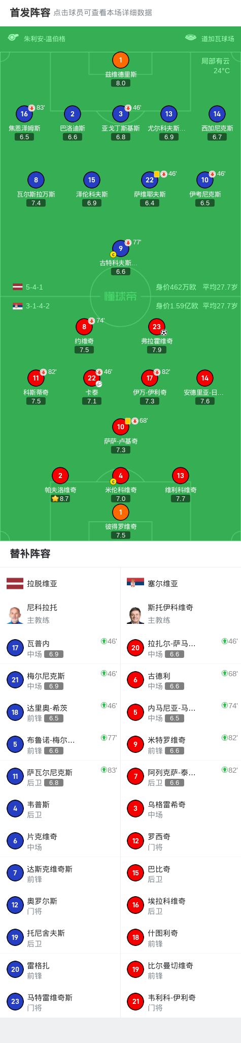 塞尔维亚1-0拉脱维亚,弗拉霍维奇一锤定音 xiaoqiao 2026-01-08 意甲 8 0 北京时间9月6日世界杯欧洲区预选赛 第一阶段小组赛 第5轮,拉脱维亚对阵塞尔维亚。塞尔维亚弗拉霍维奇破门。最终比分拉脱维亚 0-1 塞尔维亚。精彩瞬间第12分钟,塞尔维亚球员卡泰助攻弗拉霍维奇打入一球。球队阵容技术统计